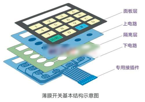 薄膜開關(guān)是集按鍵功用、指示元件、儀器面板為一體的一個(gè)操作系統(tǒng)。是選用PC,PET,F(xiàn)PC及雙面膠等軟性資料,運(yùn)用絲網(wǎng)印刷技術(shù)制造而成的 多平面組合密封的集圖形、按鍵、標(biāo)記符號顯示、導(dǎo)電及薄膜開關(guān)功用于一體的塑膠電子制品。廣泛應(yīng)用于電子通訊、工業(yè)操控、醫(yī)療器械、汽車工業(yè)、儀器儀表、家用電器、兒童玩具、軍工設(shè)備等行業(yè)和領(lǐng)域。常見薄膜開關(guān)各部分組成原料: